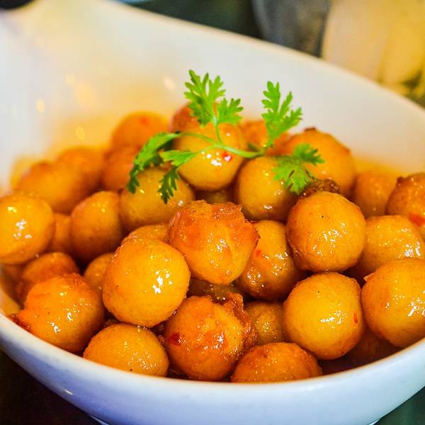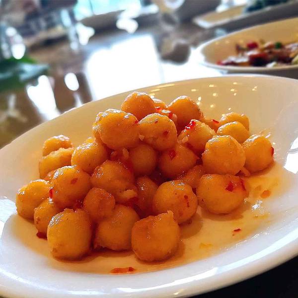 在明清宫苑和广州街·香港街这两大景区之间的珠江渔村,用餐环境也是超赞的,去时正赶上淅淅沥沥的雨下个不停,湖畔听雨也是别有一番情调。 简简单单的要了几个菜,辣炒三脆把鸭脆骨、鸭板肠、鸭膝盖炒在一起,第一次吃到这样的做法,很是新奇,味道也非常不错;竹荚鱼因为体型比较小,通常难登大雅之堂,但是肉质却非常的鲜美,值得尝试;蛋煎糯米肠是当地的特色,糯米肠被煎得焦黄,再裹上鸡蛋,又香又有嚼劲;杨梅粿红红的一盘,里面是黑芝麻的芯,外形非常讨喜,甜甜糯糯的超好吃。