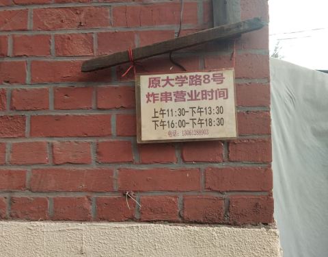 听说过大学路8号炸串儿不久 就想来吃了 老大爷11点半营业 目前搬来了14号院里 从小路咖啡馆进来右拐就是了 非常好找 老大爷很和善也很讲究 知道我等他营业前先吃了娇尔一小份饺子和一碗红豆汤了 我拿串儿的时候他就一直说“少拿点儿尝尝行了 别撑着” 哈哈哈 吃第一口老大爷就问口感咋样 如果火候觉得轻了再给炸炸 还会问味道咋样 可以再抹点甜酱辣酱 外酥脆 里柔嫩 吃完了不腻 果然与众不同 期间来吃的都是老顾客 想找怎么也能找来的忠实粉丝~突然觉得这种摊儿存在于老城区里非常非常和谐 以后还来 祝生意兴隆!