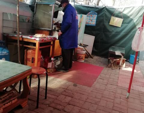 ...后偏干,吃着香,抹上了一层辣酱,哇哦,不错,就是卫生有点那啥,酱什么的都是裸露在外,毕竟是室外