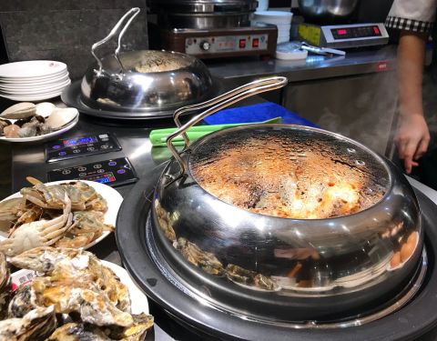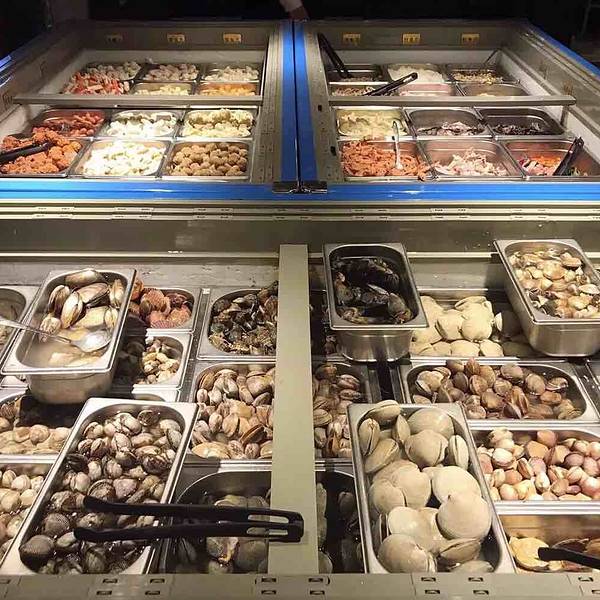 店里环境不错,服务员也都很热情,菜品丰富,海鲜区好多贝类,还有鲜虾、海螺和小花盖🦀️,而且补货还是比较及时的😆,还可以自己去炸物区旁边制作海鲜蒸锅😎,