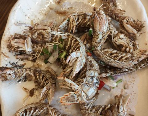 到洋山出差时正好过去拔的草,门口马路对面有很大的生态停车场,有好多鱼缸和直接海鲜的陈列槽,点了竹节虾,皮皮虾,爆炒花蛤,龙头考豆腐汤,小梅鱼,茼蒿,半斤虾份量好足,肉紧实鲜美,茼蒿也觉得意外的好吃...