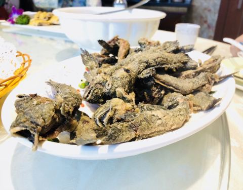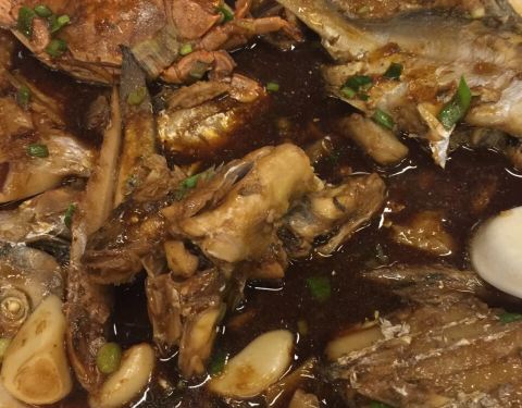 中秋小长假,芦潮港也到处都是人,5点不到店里已经坐满人,排队叫号了。店里很嘈杂,很多菜也都没有了。海鲜很一般,价格也不便宜,而且来这里点澳龙,帝王蟹之类,实在有点傻。无比怀念起家门口的海中舟,就当农家乐吃吃吧。 最好吃的,是印度人做的香蕉飞饼,薄脆少油。烧杂鱼还可以,48元一份,有两条小鲳鱼,几块带鱼,一个石蟹,还有几条小鱼,鱼肉质细腻鲜嫩,这盘算性价比很高的。另点了一盘石蟹,肉质还算饱满。所有点的菜,菜量比市区大,这点加分。