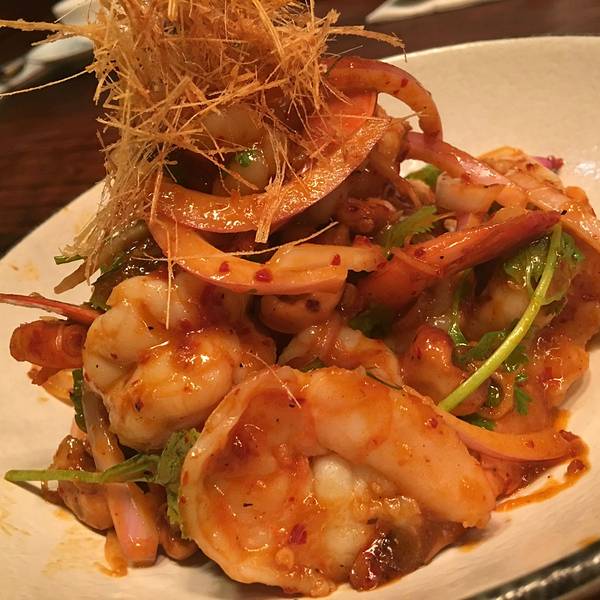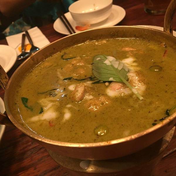 饭店在K11的 4楼,市中心地段,交通十分方便,门面挺大,很浓郁的泰式装修风格,金碧辉煌,给人典雅奢华的感觉,环境非常好。 咸蛋炒鱿鱼,不同于本帮的咸蛋黄料理,泰式用的是咸蛋黄酱,金黄色的咸蛋黄酱包裹着鱿鱼,配合着辣椒和洋葱的香味,浓郁的风味和起沙的口感,瞬间侵蚀你的味蕾,里面的鱿鱼Q弹鲜嫩,两者相辅相成,使口感更加复合,更多元化,好吃,过瘾。 虾酱空心菜,我最喜欢的泰国菜之一。海鲜酱和鱼露爆炒之后,腥味完全的挥发掉,空心菜入口海鲜的鲜香味非常浓郁,回口又有淡淡的甜辣酱鲜香,很简单的一道蔬菜,却把东南亚美食的鲜,香,酸,辣,味浓的特点体现的淋漓精致,非常正宗的的泰式美味,相当好吃。 咖喱牛腱,肉很嫩,感觉吃出了肌肉纤维,很有质感。但是,上层的食材在我看来只是绿叶,正主是这一碗咖喱。入口先是泰式香料的辛香,然后椰浆的香味慢慢的撒发出来,最后回口微甜。辛香,刺激,浓郁,清香,回甘,交织在一起,在舌尖上演奏出跌宕起伏的交响曲,惊讶之余,更多的是感动。好吃。建议配一碗白饭,绝对让你体验什么事最普通的食材,最鲜美的味道。 总体很棒的泰国料理,不管是简单的泰国街头的泰式肠粉,还是名贵海鲜的处理上,都入木三分,让人印象深刻,超爱.
