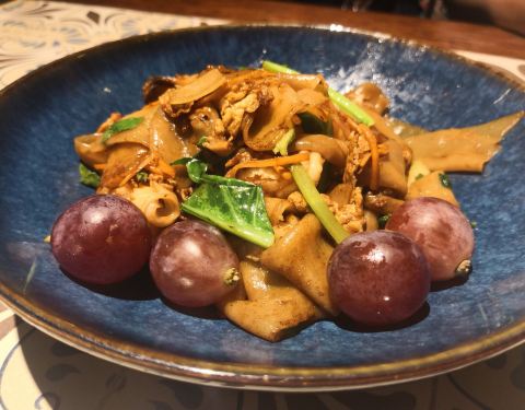 美食及品种:比较有名气的泰国餐厅,咖喱牛腩,据说用的是泰国特制的玛莎文咖喱,口感是辣中带甜的,里面的牛腱子块头比较大,肉质是酥嫩入味的,口感相当不错,特别是里面的土豆也很好吃;绿咖喱鸡,虽然看上去就一口小锅,但里面的鸡肉挺多的,绿咖喱的味道不算太辣,有股奶香味,吃起来比较柔和,但有点辣味后劲,搭配泰式香米饭拌着吃最佳;泰芒糯米饭,一共是三个饭团子,有不同颜色看上去挺有食欲的,上面浇的应该是炼乳,芒果有好大半个,又甜又新鲜;另外这家的泰式炒粉丝和虾饼也都味道不错。