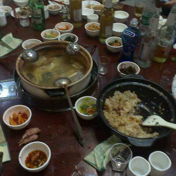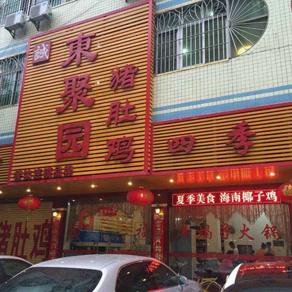 东聚园火锅城位于深圳宝安区福永街道东福围西街32号,门面装修很显眼,走到附近就能看到。因为距离上班的公司比较近,坐公交车10分钟左右就到了,有朋友来经常去这里聚餐。店面装修的比较有特点,相对周围其他餐馆店面来说,看起来上档次一点。 餐馆里面装修比较简单,但是环境很好,看起来干净卫生。老板和服务员热情,服务态度好。空调冷气足,吃火锅感觉不是很热。餐馆门面,很好认。每次来都必吃的椰子鸡,切好的生鸡块,先给给客人过目,排放得整齐,还配有椰子肉,马蹄莲,姜片;等锅里的椰子水配的汤煮开了,再把鸡肉和配料一起放进锅里煮。汤和调料的合理搭配,味道很好,一般煮熟了先喝汤,汤的味道有点甜,很美味好喝。使用的是砂锅,下面是燃气明火,使用的汤水是椰子水,所以汤的味道鲜美,吃了让人回味无穷。每次必点的砂锅米饭,味道很好,里面放了切片的腊肠一起煮的,端上来的时候锅和饭都是烫的,证明是拿这个锅在明火上煮的,解开锅盖香味扑鼻而来,往里面调入他们自制的酱油,味道更好,让人吃了一碗有想吃一碗,吃到下面的时候,还有锅巴,锅巴很香脆。吃了三碗米饭。调料放在大厅中间,可以根据个人的口味,自己取了调配。他们家的油泼辣椒很香。一次很多朋友一起聚会,吃了三只鸡,三锅饭,酒N瓶,很强的战斗力。中间服务员一直热情的为我们服务。吃后感,值得品尝的一家猪肚鸡餐馆,如果对深圳机场附近不熟悉,几个朋友聚餐不知道选择在哪里吃饭,那么选择这家餐馆,肯定不会错的。一定要吃猪肚鸡和椰子鸡,还有砂锅饭。