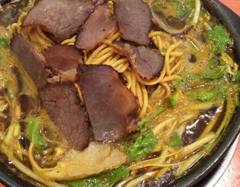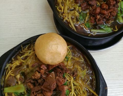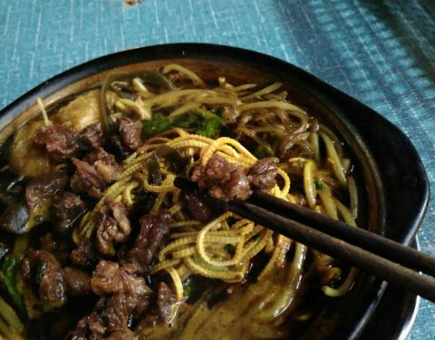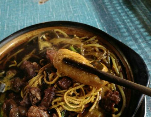 - 牛肉炖得很烂很入味,配料有千张皮,海带丝,鹌鹑蛋,面筋等等。分量足,食材丰富。一个小锅吃下去非常饱肚