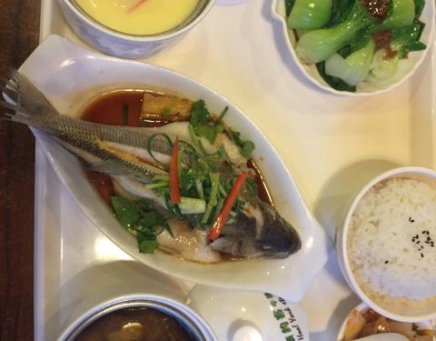 - 鲈鱼48元一份,鱼肉很嫩,还配了小菜,蛋羹,青菜,骨头汤,蛮丰盛的。豪约客中西餐厅,连锁的牛排店
