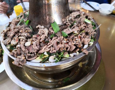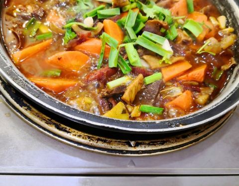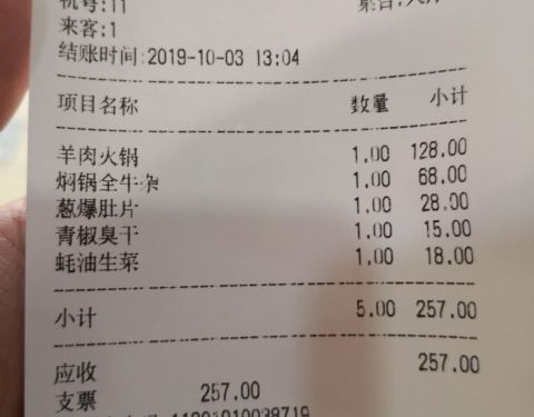 穆老九在宋城美食街是神一样的存在,以牛羊肉火锅为主,其他炒菜焖锅之类的菜品也很丰富。他家大厅很大,大大小小大概30余桌,每个桌子中午到晚上可能要翻到四次台甚至更多,据说是滁州火锅第一,不知指的是客流量还是口味。我们点的主菜是羊肉火锅和牛杂焖锅,羊肉不膻,但是粉丝易断,老板厨师应研究一下。六个人不含酒水花费257元,应该说性价比蛮高,或许这也是生意好的一个重要方面吧。