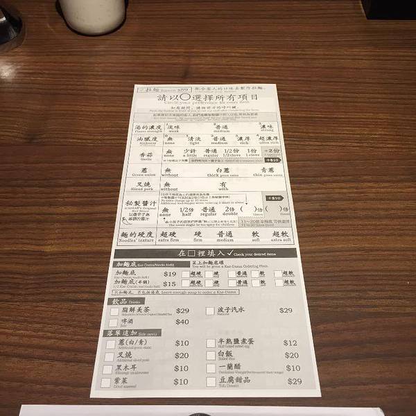 即使是一碗面只有几片肉,但是汤是真的很浓,面很Q,然后味道想要清单或者辣的可以自己填写单子,真的很赞 哦,这家去的人不多,晚上8点多过去的时候直接就进去了。另外有中文的口味选择的菜单。