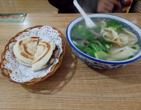 妥妥的陕西风味,来一份油泼辣子面和一个肉夹馍,味道好极了。随便说一下,他家的面汤不错,好喝