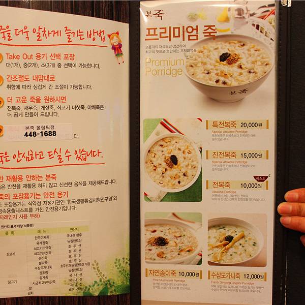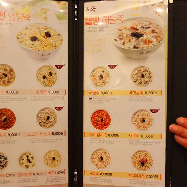 本粥(본죽) 是韩國第一的連鎖型粥店 韓國國內 有超過1000間的加盟店 選擇琳瑯滿目 除了甜品南瓜粥 紅豆粥等 還有多款韓式傳統健康粥 包括 蔘雞粥 鮑魚粥 風味蟹肉起司粥 泡菜章魚粥 ⋯創意粥品 我們 點了薊菜...