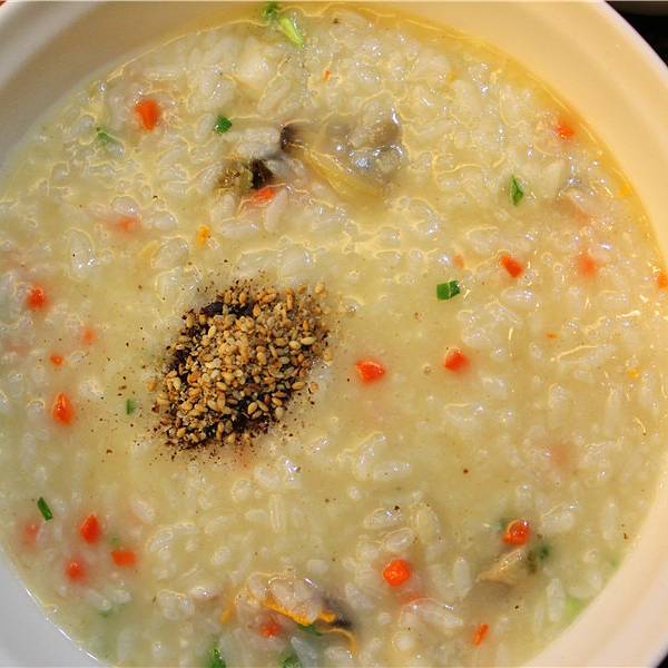 - 调味牛肉章鱼粥真是第一次吃,一端上桌香油的香气就扑鼻而来,咀嚼章鱼时脆脆的口感让人很是难忘
