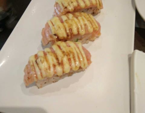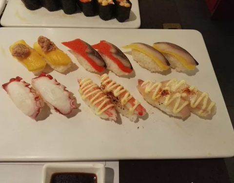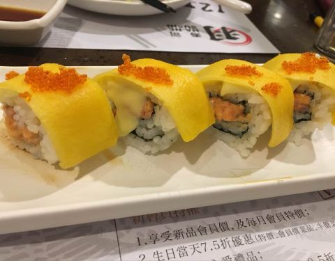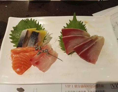 【Location】天河区东方宝泰购物广场B3楼3019铺,洗手间旁。坐地铁一号线或者三号线广州东站东方宝泰出口。【Service】我们一点多来到的时候,看到门外等位的凳子上坐满人,但是往里面看有好多空的座位,所以很纳闷。然后等我们拿了排位之后,一看就恍然大悟了,原来是半价优惠时段。走进去里面还是挺大的,目测坐个五六十人是没问题的。装修比较明亮,有放背景音乐,但是可能因为声音太小,而人又多又嘈杂所以都听不到是什么歌。服务态度还是可以的,不过可能因为人多吧,加水和收碟不会太及时,但是招手还是很快过来服务。茶位十元一位,茶包是桂花和绿茶的混合三角茶包。因为我还没进去坐下的时候就先去洗手间了,我朋友先拿座位,然后我回来的时候发现我的杯子只有茶包没有水,我问我朋友,她说服务员非要等我来了才能倒水。食物方面,种类不算多,与其他日料店相比,这里基本上都是卖寿司,其他的面类,饭类选择很少,只有一两个。价格方面,由于误打误撞的半价时段,所以还是比较实惠,叫了满桌子的东西,人均才几十块,还把肚子吃撑了,囧。【Food】*盐烧多春鱼*刚上来的时候,迫不及待要吃,但是一放到嘴里发现不对劲,是冷的,已经变韧了咬不断,所以很失望。*土佐炸豆腐*方块的豆腐表面稍炸了下,裹了一层木鱼花,酱汁是类似面豉汤的味道。*三色刺身*有三文鱼,黄希鲮,还有一种不知道是啥,黄希鲮酸酸的,但是吃起来有点点涩涩的味道,不知道是什么原因。