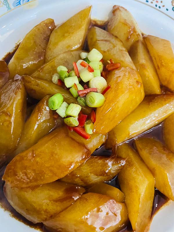 印象深刻的是肉松芋头,芋头捣烂重新塑形后过油轻炸,再配上肉松,软糯酥香口感丰富,丰常棒的创新菜。 红烧鱼尾,性价比超高的菜,因是千岛湖大鱼鱼尾,肉足够多,极其嫩,常年和鱼打交道的厨师烧这道菜应该是得心应手的,所以味道没得说,必点菜。