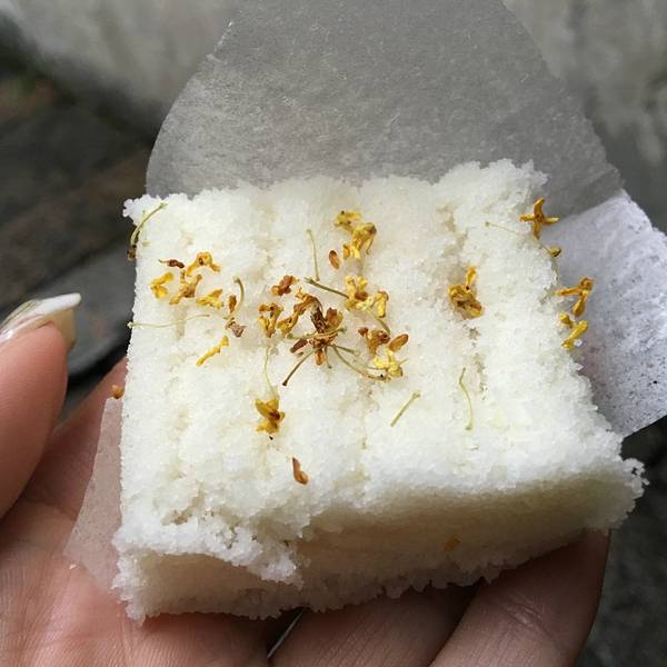 本来我对于糕点并没有太多爱,不过吃完旁边油墩子看着这边排队也很长又想吃点甜的所以还是吃吧,都是现蒸现卖的,正好一格卖完所以等了几分钟,白白香香的桂花蜜糖糕,阿姨会沾一张纸放在我们手里,还叮嘱马上吃...