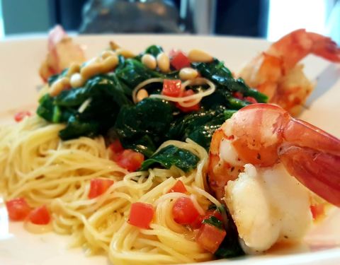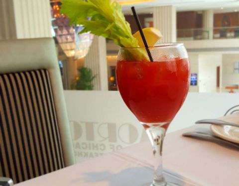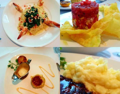 『莫尔顿牛排坊』 一顿美好的美式早午餐从餐前面包开始,莫尔顿家的餐前面包个头比较大,上来是一个完整的面包,面包上撒了一些坚果碎作为点缀,现烤的面包热气腾腾,内部松软,搭配奶酪是最好的吃法。 血腥玛丽,这款早午餐开胃酒,这杯酒的用料可是相当重口味,主要混合朗姆酒与番茄汁,配以芹菜盐,微甜酸辣的喼汁,柠檬汁等,最后再配上芹菜叶,酸甜苦辣咸,如此复杂的组合,味道相当霸道。 金枪鱼多宝塔,最上层是鲜美的金枪鱼肉碎,鲜红欲滴的颜色十分诱人,用黑胡椒中和了金枪鱼肉的油腻口感。下边是牛油果,洋葱,番茄,玉米粒堆砌而成的果蔬塔,十分爽口。 珍宝蟹饼,这道菜是莫尔顿的获奖菜品,来这里一定要尝一下,煎烤而成的蟹饼,紧实的团在一起,但却又很容易的切分开来。用喷枪烤过的柠檬,中和了一些酸度,加热后的柠檬更甜,挤在蟹饼上,提升一个鲜度,相比蘸沙拉酱吃,要美味很多哦! 上等肉眼牛排五分熟刚刚好,表层微焦,内层鲜红,超嫩的口感,香甜的汁水,顺着纹理分割,刀叉与牛扒悦耳的摩擦声和优雅的钢琴伴奏毫不违和。佐餐土豆泥细腻香甜,淡淡的奶香,唯一一点美中不足的是土豆泥给的有点多,从视觉角度,和牛排的体积不相上下,过于显眼,并不能很好的衬托主菜牛排。 烤大虾配意大利天使面,大虾肉质饱满,个头十足,每一种材料都经过最佳烹饪方式,菠菜做的相当不错,没有涩涩的口感,入口嫩滑,用这个词来形容菠菜,可想而知是做的有多出色。 地址:金宝街99号丽晶酒店2层