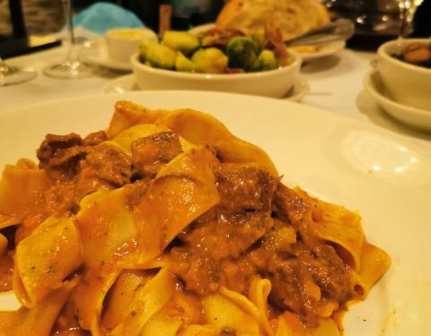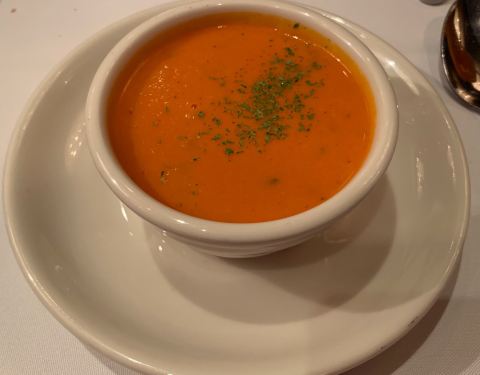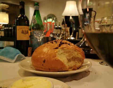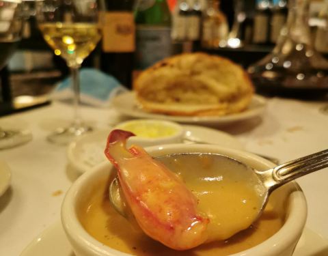 临时预约来吃饭,朋友7:30就到了,我送完最后一个蛋糕8:30可算坐上桌从来没过的节疫情当前居然有了仪式感从1月20日之后第一次用BB霜。 之前来这家吃过,印象实话说一般,没想这次留下了极好的印象珍宝蟹肉锦绣杯^蟹肉超级良心餐前面包^由于太久没吃到热面包,抹上黄油一口下肚的瞬间差点泪目烤瑞士奶酪洋葱汤^和|龙虾汤^都很好喝,龙虾汤可以看到一个大蟹钳纽约西冷牛排^心心念念的牛排终于吃到口,一定要大喝几口红酒烩牛肉意大利宽面^太爱了每一根面条都裹满酱汁,一口都不想浪费。配的小菜也很棒,感觉不到是一天复工。吃得超级开心,两瓶葡萄酒轻松下肚。 当晚大概有10桌客人,每桌都在小声聊天,莫名有一种美国往事里餐厅的感觉,服务也很贴心,侍酒师赞。