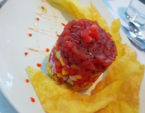 金枪鱼多宝塔,最上层是鲜美的金枪鱼肉碎,鲜红欲滴的颜色十分诱人,用黑胡椒中和了金枪鱼肉的油腻口感