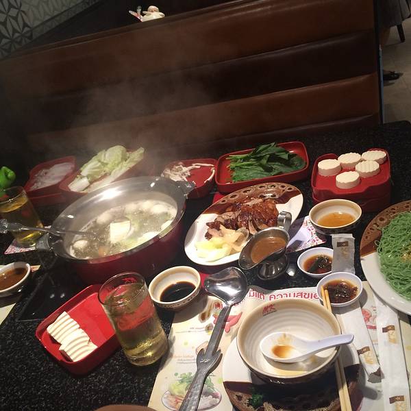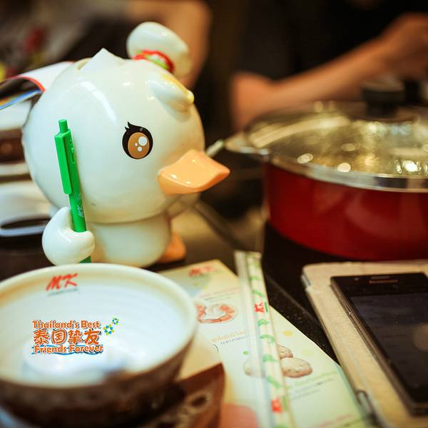 MK餐厅的火锅在泰国很有名,在曼谷就有很多家分店,基本上每家大型商场里都有MK餐厅。MK餐厅装饰是传统的泰国风格,而且这个餐厅很注意各种细节,即便是处女座到这里来都会感到满意。MK有四种锅底:鸳鸯锅底、传统锅底(就是清汤锅底)、韩式泡菜锅底和日式黑毛猪锅底,点锅底的话建议点鸳鸯锅,萝卜点的是699的两人份鸳鸯套餐,辣的就是冬阴功味道,不辣的有一点儿奶香,觉得比冬阴功好吃。每个桌子都有个点餐的仪器,直接点了一会就会送来,也可以随时加餐。觉得这种模式不错,也不用不停的叫服务员。每个桌上还有一只卡通鸭子,是用来放点菜单以及笔的,很多来这里的小朋友都会把玩小鸭子。【萝卜推荐】独特的泰式酸甜辣沾酱,推荐berry shake。MK的冰淇淋味道也不错,很浓烈的奶香味,两个求只要68泰铢,而且球很大,性价比超高。龙眼蜜:龙眼蜜配上碎冰,含在口里,感觉都能把整个人都甜化,虽然龙眼蜜很甜,但吃起来一点也不觉得腻。【温馨提示】在MK餐厅吃火锅是要服务费的,加税一共17%的服务费。一定要吃MK餐厅配送的酸甜辣粘酱,酱的味道超级好吃。MK不光有火锅和泰国菜,这里也有中国菜,比如说烤鸭之类的。【营业时间】上午十点到晚上十点,建议晚上去,因为中午人比较多。【餐厅花费】价格不高,两人消费大概600泰铢能够解决。