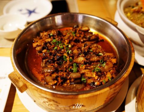 海豚的模样挺特别,但味道我觉得一般,偏干 木桶老干妈肉碎蒸茄子,55元, 剁椒蒸九肚鱼,58元...