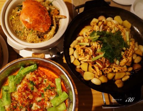 驰名潮式卤水拼、生拆九肚鱼茸羹、上汤伊面焗桂虾、捞起葱油桂花鱼、脆皮风沙黄金鸡、姜葱炒万山红蟹...