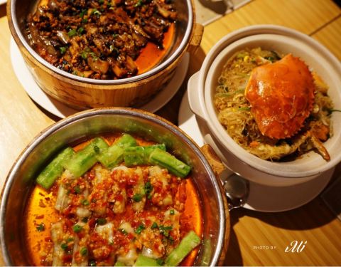 - 驰名潮式卤水拼、生拆九肚鱼茸羹、上汤伊面焗桂虾、捞起葱油桂花鱼、脆皮风沙黄金鸡、姜葱炒万山红蟹...