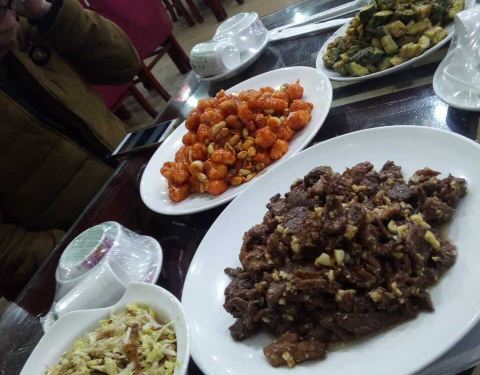 台儿庄路上大光明桥附近的一家饭馆,要说环境还是可以的,门脸算是比较大的那种,也非常醒目,内部装潢还算可以,稍显陈旧,但是卫生状况良好,大厅稍微有些拥挤,就餐的时候会觉得有些吵闹,不过还好在接受范围内,并不严重,菜品方面,都是家常菜为主,推荐这家的酱爆洋白菜,炒得味道非常好,酱油放的很足,炒出来颜色有些重,但是味道很到位,鱼香鸡丝,很大的一份,鸡丝口感很嫩,整个菜的味道微甜,很好吃,孜然羊肉炒得也很少,虽然不是回民馆,但是味道一点不输给清真的口味,羊肉口感很嫩,不会很难嚼,服务方面,稍显不足,人手感觉有些不够,服务员喊不过来的感觉。