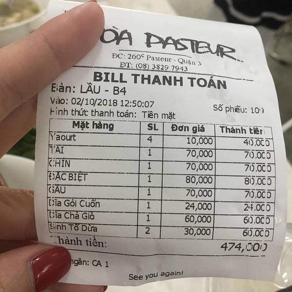早晨出发大概就是午饭时间了。。。大众点评第一,粉红教堂附近。挺好吃的! 来越南必吃的pho。味道到现在我还怀念,就是牛肉有点老! 地址:胡志明市第3郡巴世德街260C号 推荐:什锦粉(肉丸好吃)、炸春卷、椰子冻! PS:越南春卷是分夏卷和春卷的,外面是白色薄薄皮那种,里面包的是薄荷叶,不习惯味道的慎点!菜单。。。拍的有点糊了当当当,著名的越南PHO这是4个人吃的价格,越南价格换人民币,去掉3个0,除以3!