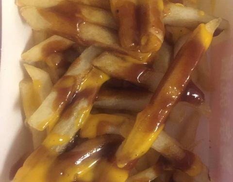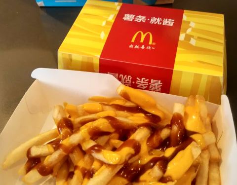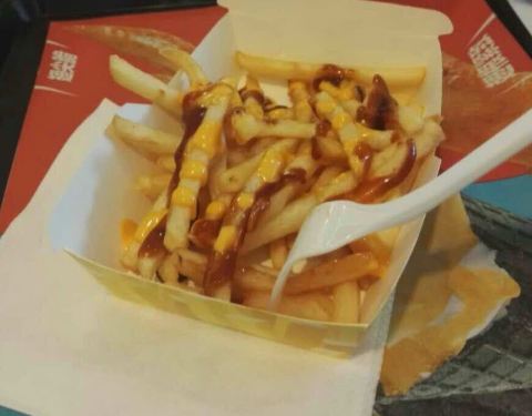 好吃!看起来就挺好吃的样子,刚炸出来的薯条外皮脆脆的,上面淋的应该是番茄酱和芝士酱,还蛮好吃