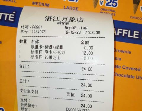 - ...品尝,原价33元天价的特大杯华夫脆暴风雪,支付宝口碑特价16.5元,用了5元红包实付11.5元