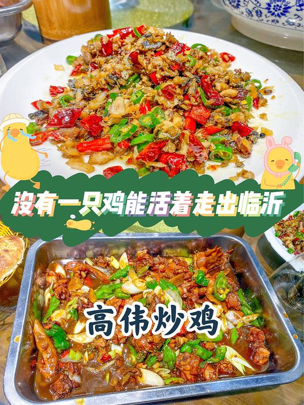 🈺️【没有一只鸡能活着走出临沂】 · · ▷高伟炒鸡总店 店位置:山东省临沂市金源路与沂州路交汇处东行500米路北 *没有一只鸡能活着走出临沂,这句话真的一点都不夸张,临沂人爱吃鸡是出了名的,临沂人做炒鸡更好吃,更是出名的,在外地的时候最想吃的就是临沂炒鸡 *临沂人做炒鸡都挺好吃的,万里挑一的是只有两家我是最爱吃的。 *【高伟炒鸡】辣味比较足,就像是家里妈妈炒的辣辣的酱香味的鸡,鸡块切得很小,但是都保证是完整的一只鸡 *【特色鲅鱼渣】也是一道临沂老特色的菜,鲅鱼炸过之后没有腥味,味道辣辣的,卷煎饼真的是非常好吃 *【酸菜鱼】鱼肉非常嫩,但是我稍微感觉味道有些咸 *【老式鸡蛋汤】我家里外出吃饭必点的汤,临沂的鸡蛋汤保证是和外面的不一样,比较浓稠比较鲜,有一点白胡椒的提味,冬天喝起来辣辣的 *他家菜品都挺好吃的,基本不会踩雷 *需要定包间必须打电话【提前预定】这里吃饭的人多,上菜速度也会慢一些 *环境图没有拍,店内非常整洁亮堂,适合宴请和家人吃饭的哦