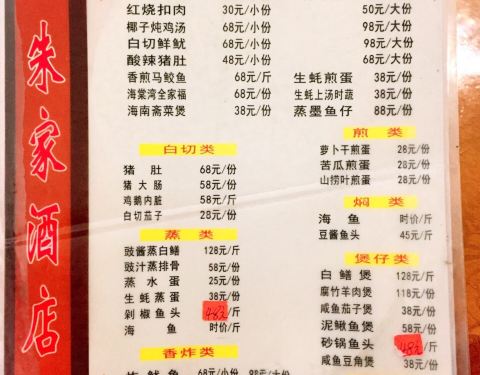 这家店在海棠湾叫做朱家酒店,最出名的是藤桥排骨,就是卤制后油炸,你可以把它想象成肯德基油炸香酥类;文昌鸡炖得比较软烂,我不喜欢太硬的,配上当地很辣的黄辣椒酱与酱油,很合适;甜酸罗非鱼做得也不错,皮...