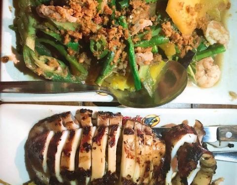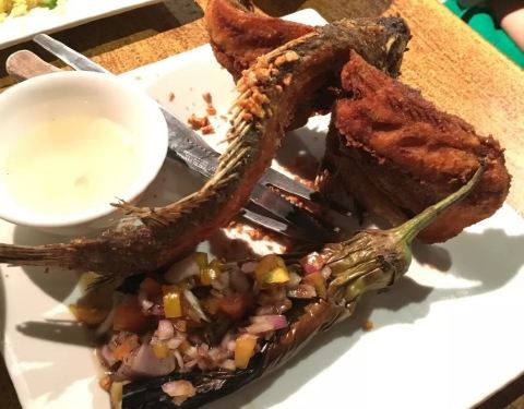 三层,有空调,服务员统一着装,都是颜值不低的年轻人。在当地来说真是很好的饭店了。晚餐6点开始,幸运的话还能座在海边露天位置,边看落日边用餐。不过要忽略海边的人山人海和炎热的自然温度。据说是菲律宾菜,点了几个推荐菜 【烤肘子】皮香味浓量大 【烤鱼】热带的大鱼自然肉是比较粗的。 【烤目鱼】真心量大,目鱼肉厚,嫩。 【芭蕉叶包饭】芭蕉叶用完了,上来救这个人炒饭的样子,量超大,里面货色不少,这一桌中居然是最好吃的。 【烩炸蔬】刀豆、苦瓜、南瓜、胡萝卜等煮熟后拌入类似意面酱的肉酱汁。 价格合适,我们4人吃不完还打包了一堆,貌似人均500披索。