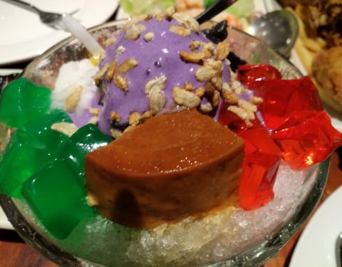 在沙滩上,由于去的比较早,没有等位。汤比较咸,是要配饭吃的。里面肉比较好吃。点了四季沙冰,里面混合了好几种水果。鱿鱼是甜口的个人比较喜欢。猪蹄配应该是姜丝。 花了2000多P。