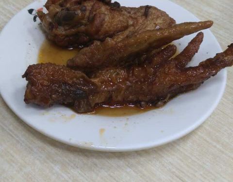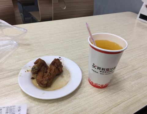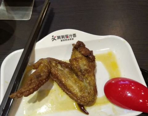- 面还没上,先来个鸡翅和鸡腿的照片,儿子很喜欢这里的茄汁面,味道不错,不过量好像比上次少了些,总体可以
