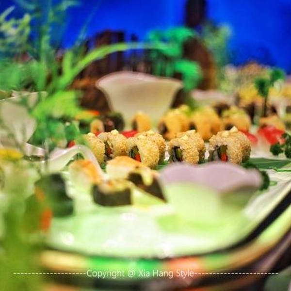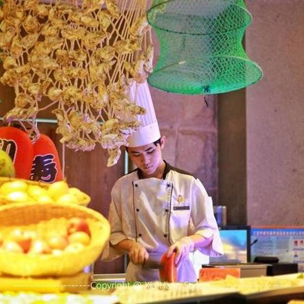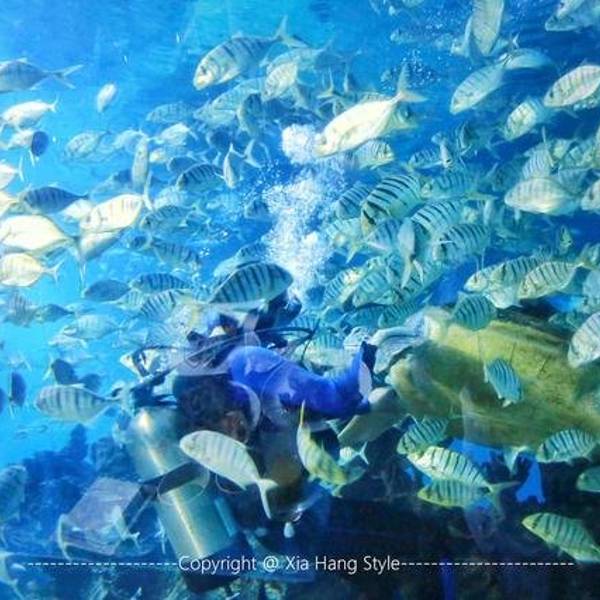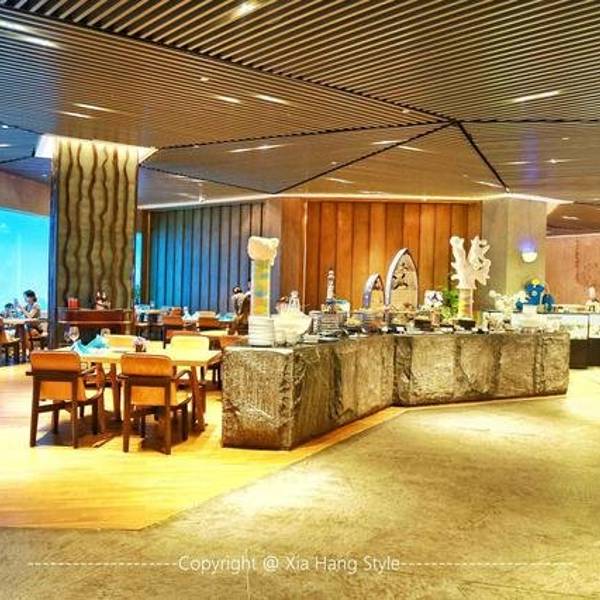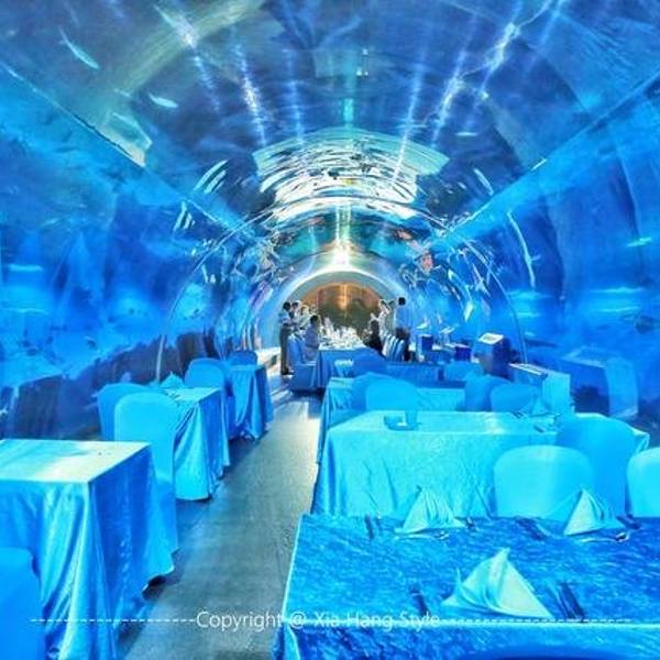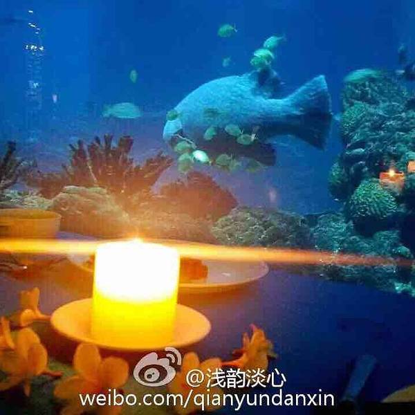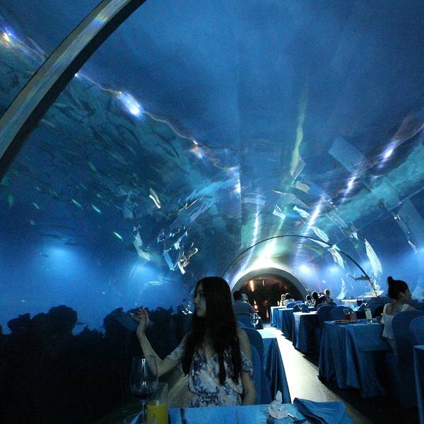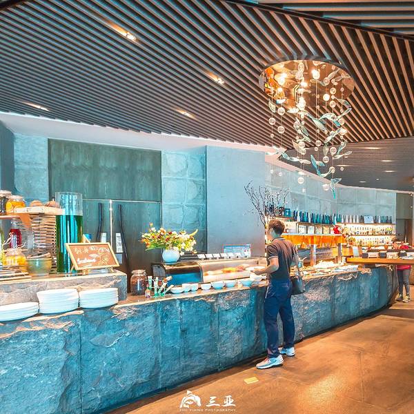 【印象】这是我在全国见到的最美的餐厅一点也不夸张,之前在迪拜帆船酒店知道有海底餐厅,没想到国内也有。海底餐厅开在三亚天房洲际酒店的负二楼,这家酒店最有名的也是这家餐厅,很多客人都是因为这家餐厅而选择旅途定在这儿的。餐厅的面积很大,餐桌都是在海底玻璃旁。 【环境】能在海底一边欣赏着各种鱼儿游一边看着美人鱼帅哥表演互动,这样的环境太适合情侣和带着孩子的家庭,餐厅的装修建造也真是大手笔啊。有一条海底隧道,那是最好的位置。甜品区也很丰富,有十几款甜品,每款都很诱人,最喜欢巧克力和拿破仑口味的,巧克力的可可非常的正宗浓郁,拿破仑最能考验甜品师傅的功力。刺身的品种也很多,不过可惜今天没有三文鱼,可能也是最近污染比较严重,怕食品安全问题,不过北极贝挺新鲜的,吃起来有嚼劲。芥末很冲鼻。Tips: 1、交通:这家酒店的交通非常方便,自驾到海棠湾的免税店附近就可以看到,应该来说如果喜欢海棠湾,这家半山半岛是最合适的。 2、预定:餐厅的客人很多,需要提前预定,尤其海底隧道的位置,更需要提前几天预约,因为老有客人或者团队包场。 3、wifi:有免费的wifi,而且信号不错。 4、表演:每天晚上7点开始有演员表演,可以互动,而且非常精彩。