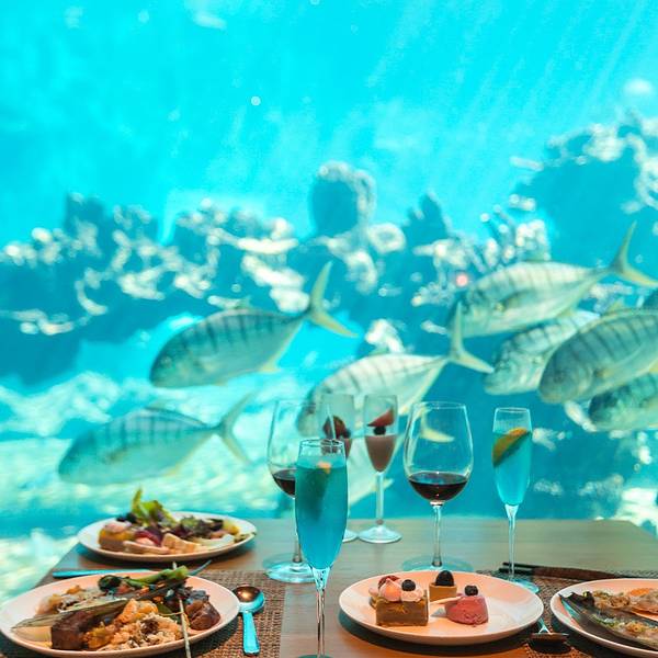 好不容易住次洲际,当然不能错过它这边响当当的海底餐厅,那可是在海棠湾都叫得响,在某app里是海棠湾排名第一的餐厅,不只是因为它丰富的自助餐,还因为它惊艳的用餐环境。菜品比早餐多了更多海鲜,还有海南鸡饭,就是海南特色的菜还是少了点,可以单点鸡尾酒和香煎鳕鱼。不过在这里美食变成了配角,环境倒是成了主角。毕竟是在海底吃饭,各种大鱼小鱼就在身边游来游去,太梦幻了,坐在玻璃前,感觉自己就是个小公举!冷不丁飘过好大一只石斑鱼,时不时就能看到杰克风暴,潜水员就在附近潜来潜去,人家潜水能看到的,我们吃饭也能看到。太阳直射时还能看到彩虹呢,这种身临其境直接在海里的感觉,真的很梦幻。在这犹如童话世界的餐厅里,一顿饭也就吃了三四个小时……