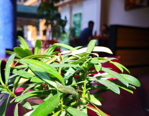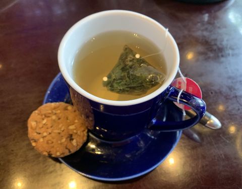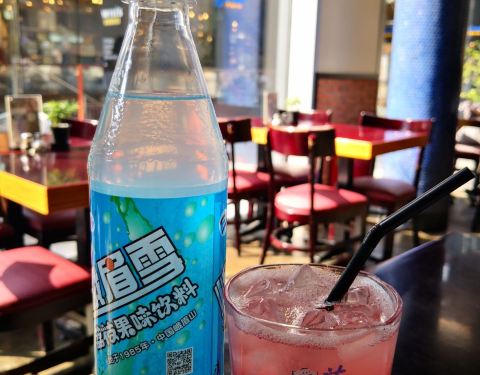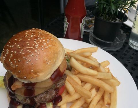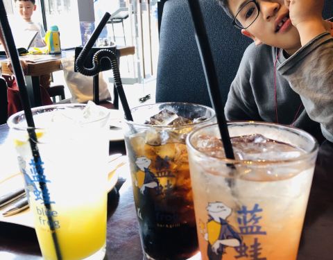 某个阳光灿烂的下午,在太古里闲逛,路过蓝蛙,走不动了。网上团购了一个套餐。进去坐坐。 虽然是非周末的下午,蓝蛙的生意还是很好哦,尤其是室外的位置差不多都坐满了。 室外有点热,还是决定在室内吃。套餐是一个汉堡一杯西柚汁。汉堡搭配了一些脆脆的玉米片,挺好吃的。汉堡的肉肉很厚实,味道也不错。西柚汁很清爽,喝了一半倒了一部分峨眉雪,你猜是啥子口感。