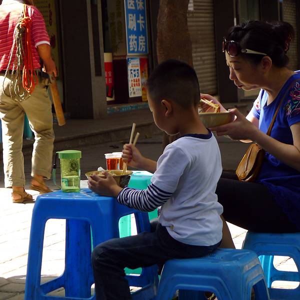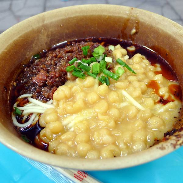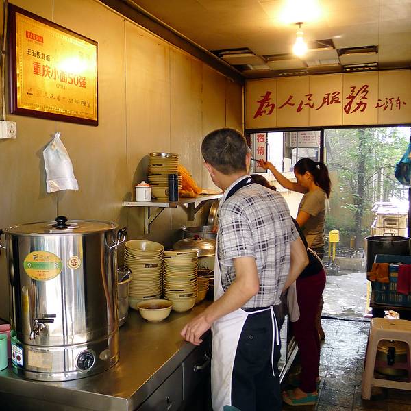 王五板凳面店铺的门面比较小,门口很多小板凳,一张高一张矮的,高的是当小桌子,矮的是凳子。由于下雨,来的人不多,不需要等位。面的话只有几款,有2两和3两的选择,早餐我觉得2两已经足够,可以要辣的或者不辣的。辣的也是微辣,可以接受范围内。 由于我们还打算吃其他的店,5个人,要了2碗面大家分着吃。豌豆小面要了不辣的,豌豆煮得很粉,不错。不辣的味道相对淡一些。另外一碗豌豆+碎肉的,要了辣,味道就比较香一些。