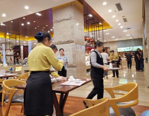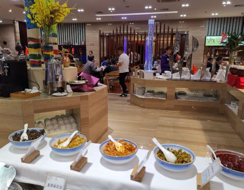 [环境]聊城阿尔卡迪亚酒店配套的餐厅,酒店大堂下地下一层即是。酒店停车很方便,车位充足。五星级酒店内部装修自然不错,面积不是很大,但是有超大包间。 [服务]服务较好,但与正规五星级酒店的服务标准还是有一定差距,毕竟不是一二线城市。 晚上吃的自助餐,不过来的晚的话也可以零点。自助餐品种一般,海鲜、鸡鸭鱼肉等都有,但是每次只上一点,而且很多热门品种,比如雪蟹腿、三文鱼、麻小等只在最开始上一两次,然后就没有了。长假人又多,基本抢不到。果汁特别寡淡,差评。每天有一种例菜,小米辽参或者龙虾。 总体来说,性价比一般,住店的话来吃吃也就罢了。
