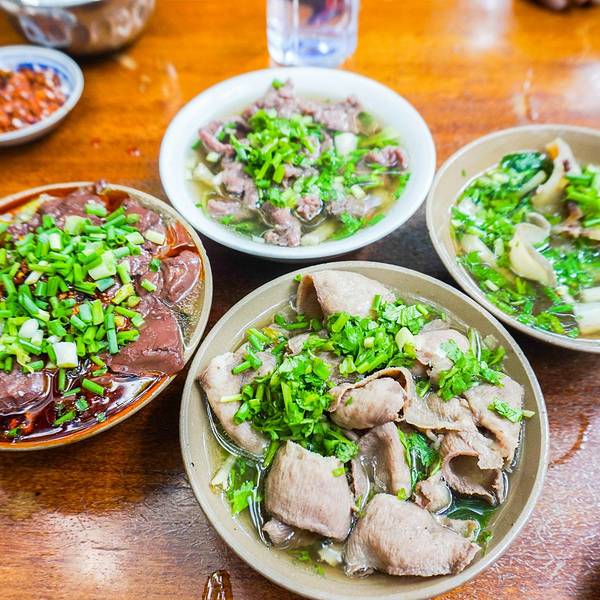 大概了尝了尝豆腐脑后留了点肚子,就在乐山的江边逛逛走走了,中午的午餐定在大众点评上排名很高的“易老八跷脚牛肉”,到了这家店后发现2年前来乐山也是来的这家店。 因为都还不是特别饿,所以没有点大杂烩的锅,点的是分部位的单独的小碗,每碗的均价就在10块左右,分量和价格都很划算 先上的是我一直都很喜欢的牛筋,口感有嚼劲又很好咬,非常的软糯。血旺,非常非常的嫩啊!看起来其貌不扬但是太嫩了,筷子一夹就碎,必须要用勺子。外面的红油辣椒非常的香,这碗获得了一直的好评。牛肉,嫩。很嫩。我最近的新欢--牛舌。 太TM好吃了!我爱这个口感!!!午餐全家福。这一桌加上蘸料和两瓶饮料才46!!超值!!