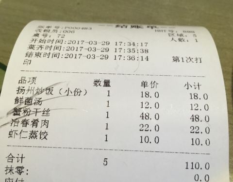 一个人点的貌似多了些,狮子头好吃,松软不腻。吃多了家乡菜到这边换换口味,总体很清淡,蟹黄包稍甜口,还不错。每道菜量不大,价格适中,适合1个人吃的淮扬菜馆。