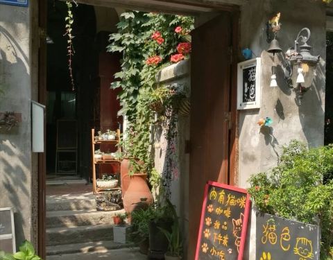 猫色猫咖啡,店里猫咪的种类和数量非常多,位置在武汉的泰兴里,在一个栋居民楼里。门口很多绿植,郁郁葱葱。咖啡馆布置得也十分温馨