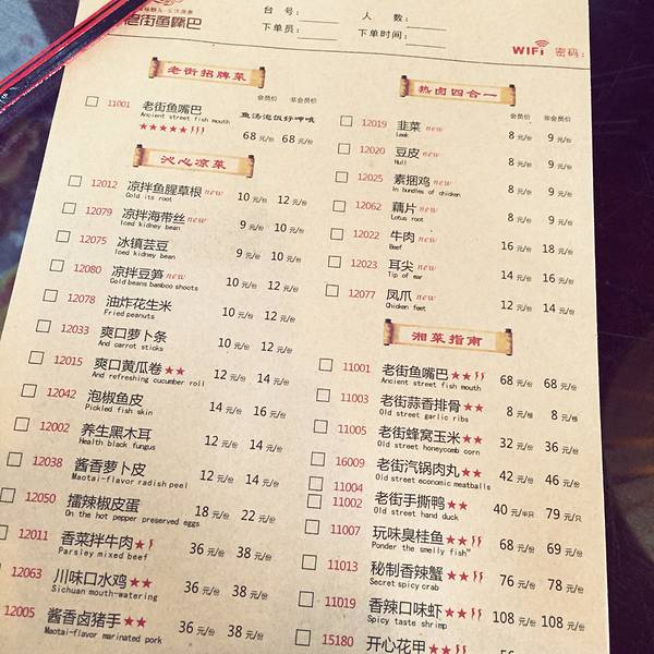 咸蛋黄炒茄子 香芋排骨 老街鱼嘴巴 招牌鱼嘴巴 小炒黄牛肉 鱼嘴巴 酸辣藕丝 大碗淮山 口水鸡 粉蒸肉 香辣花甲 皮蛋炒辣椒 大盆猪脚 黄瓜皮炒肉泥 辣椒炒肉 蒜香排骨 手撕鸭(量太少) 清炒莴笋尖 荷香糯米蒸排骨 蜂窝玉米 鱼嘴巴火锅 大盆花菜 养生猪肚鸡 老街猪肚煲鸡