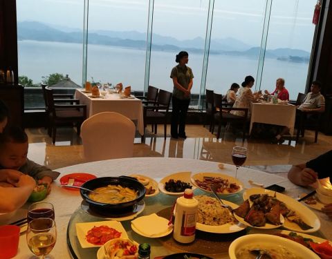 非住客也可以在这个五星酒店里的中餐厅用餐的,本来以为外面的农家乐餐馆味道会更地道,没有想到这里的杭帮菜做得也那么好,千岛湖鱼头的味道别提了,鲜!最令人欣喜的是从餐厅里能看到千岛湖!服务也是五星级的。
