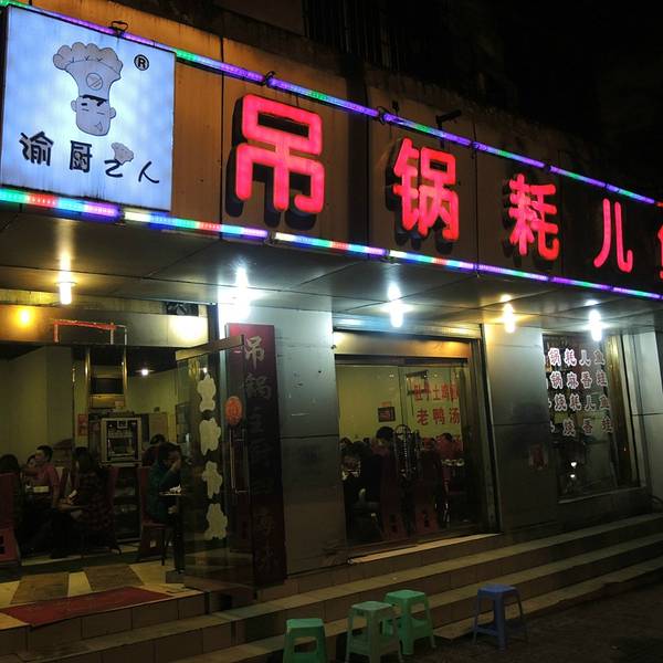 在重庆大礼堂周边很悠闲地游玩了半天儿,心情大好!回去的路上一商量,决定晚饭来顿火锅庆祝一下吧! 下了公交车,就看到这家“吊锅耗儿鱼”,名字很个色又有趣,透过穿户望进去,高朋满座,热气腾腾,一定错...