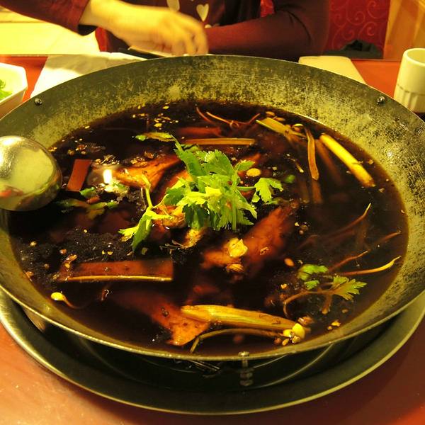 有点像干锅的样子,味道很不错,都觉得好吃,大锅158,5个人吃刚好够。服务员大都是大姐,很热情很热情!