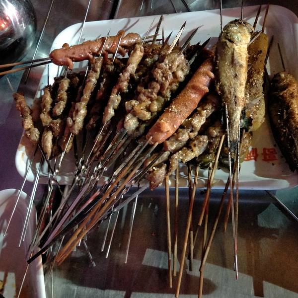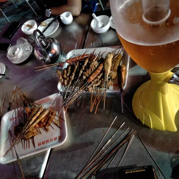 周末朋友请吃饭,我和老公本来想找安静一点的地方吃,结果朋友强力推荐了这家烧烤店,看他们这么期待,我们也没好意思扫兴,就跟着过来了,位置在东城区运河路和沂州路交叉路口往西200米处,这一带特别是沂州路都很热闹,很多小吃和烧烤,这家烧烤店的味道确实是不错,对于我们这样吃得都找不到好吃的的吃货来讲,已经是个很不错的惊喜了!首先店名就让人觉得耳目一新,老公他们兄弟几个聚餐来这也恰当,其次店内既有包厢,店外还有很多桌子摆着,还有一个可以拉出来的雨棚,以备下雨的时候用,活脱脱的就一经典的烧烤店。店里的菜单也做的很合理,每桌一张,自己点,点了就画勾,看了一下菜单,这么美味这个价位还是相当合理的,只是酒水相对来说价格要高一点,俗话说吃烧烤那就一定要配啤酒,酒水价格也应当合理一下,希望店家能调整一下,不过常来吃的朋友建议充值会员卡,那样酒水有很多优惠.我们几个没有点瓶装的啤酒,直接要了3炮扎啤,近20斤酒,居然都喝完了,惊叹男人们的酒量周边环境也相当不错,很多小吃,对面就是光大银行和家家乐超市,相当方便。我们吃烧烤的时候看到店家有放投影仪,还以为可以看奥运直播,没想到没有投影幕布,直接投影到了玻璃上,我真的也是醉了,希望店家可以改进,改进后一定会带来更多的顾客的。吃完后,我们大家都很满意,实在是一家味道极好的烧烤店! 等不及了,赶快晒晒我们的成果吧: