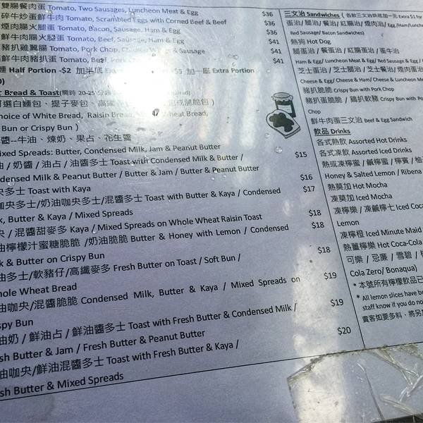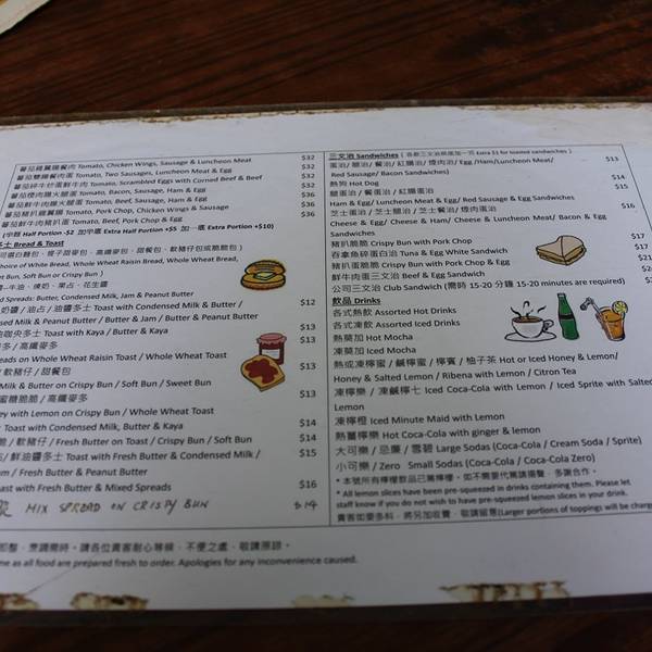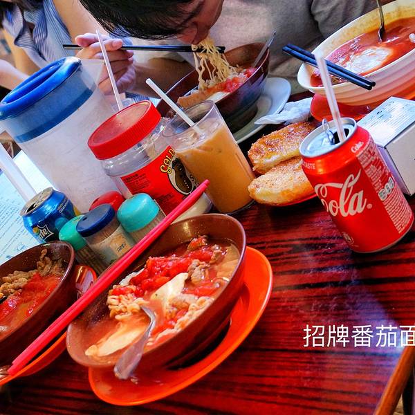 他们家的品种 就是番茄汤底的通心粉或公仔面外加午餐肉窝蛋牛肉什么的 各种多士蛋治 还有饮料