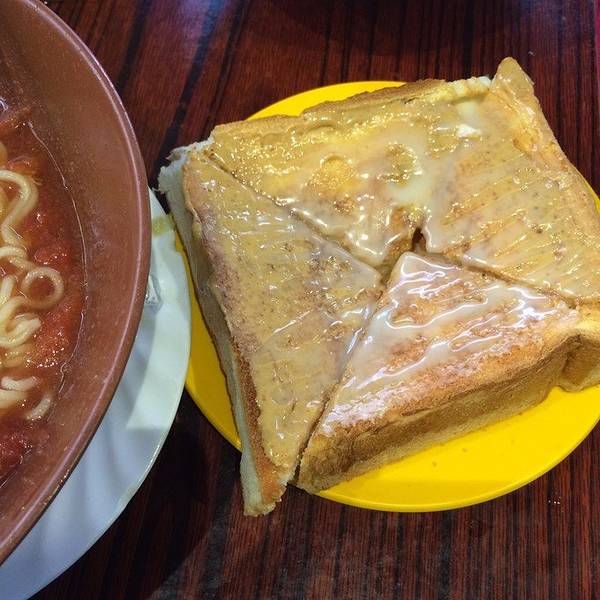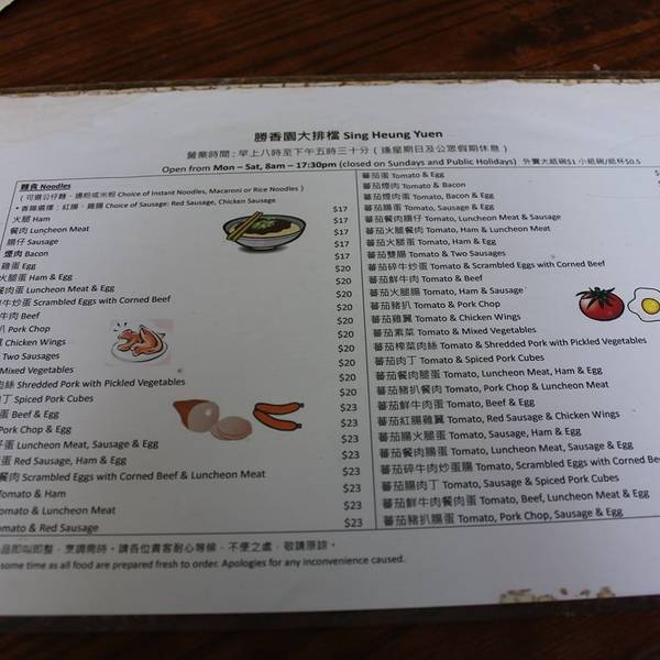 上文说会有惊喜 嘻嘻 就是现在了 因为妹子一直心心念想着胜香园 所以我们早餐就去那里解决啦 去到的时候九点多 座无虚席啊 刚来的人要碰巧看见有人吃完起身就要马上过去占位置 不然不知道等到什么时候啊 胜香园是大排档式的 搭着个蓬在头顶上遮风雨 有一个小屋子是厨房 门前摆着好多张桌子还有几把大风扇 店里的阿姨都是本地的老街坊啊 很亲切的咧 就是忙不过来连招呼你的时间都没有 以前看TVB总是会看见这家店的镜头 这次身临其境哈哈 这家店的东西的确是好吃才会引了那么多慕名前来的客人 在中环这个地方就是总能碰见外国人嘛 就连这种传统的港式老字号也能看到他们的身影 可见有多火哦 来这里吃东西的人多多少少都有一份港式情怀~ 地址: 香港岛 中环美轮街2号排档(歌赋街口) 就是在九记牛腩对面哦 茄牛通(番茄牛肉通心粉) 奶油脆脆 咸柠七 都是推荐 他们家的品种 就是番茄汤底的通心粉或公仔面外加午餐肉窝蛋牛肉什么的 各种多士蛋治 还有饮料 为什么只有番茄汤底呢 因为他们的番茄汤底做得实在是太好吃了!用心熬煮加上新鲜番茄的汤底 真心赞! 通心粉和公仔面的区别就是通心粉的汤底会比较浓哦 奶油脆脆就是奶油猪 炼奶淋在烤脆的土司上 甜甜的 咸柠七也是超级无敌赞的 那口感 简直了!! 他们先把柠檬搓烂了放在杯子里加上特制的盐??反正就是给你一罐七喜自己倒进杯子里 七喜的气泡咸咸的盐味酸涩的柠檬味 咕噜咕噜地 你自己去试一下就是了!